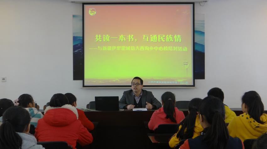 为落实《关于进一步做好新疆与江苏“百万中学生结对子”工作的通知》,为引导两地中学生交流交往交融,共同培育和践行社会主义核心价值观,我校于2014年12月与新疆伊犁霍城县大西沟乡中心校正式结对并于2015年3月19日开展了“共读一本书,互通民族情”共青团员文化交流活动。