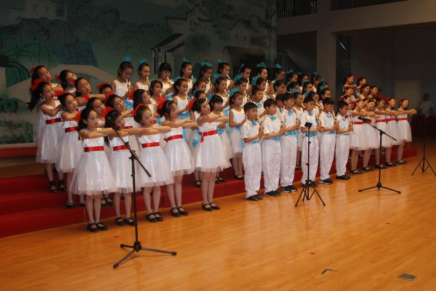 表彰结束后,文艺汇演在校铜管乐美妙的乐曲声中拉开序幕。这支年轻的校铜管乐队成立时间不到一年,但他们娴熟的技术让台下的观众不时发出啧啧赞叹。曙光分部锡剧团表演的节目《金殿封相》,向观众呈现了他们高亢的嗓音和扎实的戏曲功底。华小本部古筝和葫芦丝兴趣小组的民乐小合奏《欢乐的泼水节》,琴声宛转悠扬,把观众带到无限的遐想中。小学分部的拉丁舞《牛仔很忙》刹那间将欢乐的气氛推向了高潮,他们激情活力的表演博得了在场师生以及家长们此起彼伏热烈的掌声。